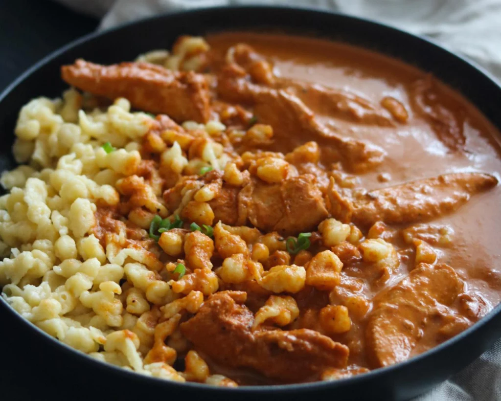 Ganz fantastisch passen meine Selbstgemachten Spätzle zu diesem Paprika Rahm Geschnetzeltem.